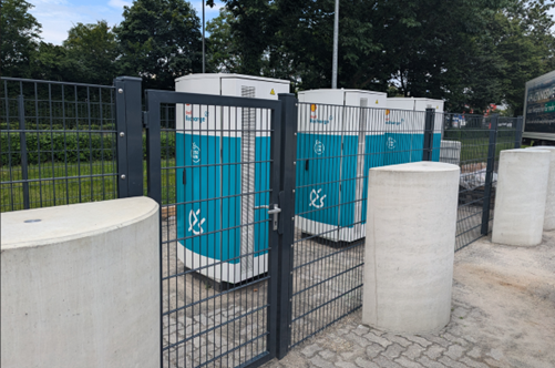 Die Ladegeräte und eine kleine Trafostation befinden sich auf der anderen Seite des Hofes in einem abgezäunten Bereich, die Kabel zu den Kragarmen wurden quer über den Hof eingegraben.